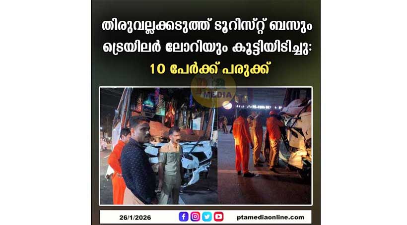 തിരുവല്ല: എം സി റോഡിലെ തിരുവല്ലക്കടുത്ത് രാമന്ചിറയില് ടൂറിസ്റ്റ് ബസും ട്രെയിലര് ലോറിയും കൂട്ടിയിടിച്ച് ഉണ്ടായ അപകടത്തില് 10 പേര്ക്ക് പരിക്ക്. ലോറിയുടെ ക്യാബിനില് കുടുങ്ങിയ ഡ്രൈവറെ അഗ്നിരക്ഷാസേന എത്തി രക്ഷപ്പെടുത്തി. ഇന്നലെ പുലര്ച്ചെ ഒന്നരയോടെ ആയിരുന്നു അപകടം. തിരുവല്ലയിലെ കുറ്റൂരില് നിന്നും വിനോദയാത്രയ്ക്ക് പോയ സംഘം സഞ്ചരിച്ചിരുന്ന ബസ്സാണ് ചങ്ങനാശ്ശേരി ഭാഗത്തുനിന്നും തിരുവല്ലയിലേക്ക് വരികയായിരുന്ന ലോറിയുമായി കൂട്ടിയിടിച്ചത്. ട്രെയിലര്ഡ്രൈവർ, ബസ് ഡ്രൈവർ, ബസ്സിലെ യാത്രക്കാരായ എട്ടുപേര് എന്നിവര്ക്കാണ് പരിക്കേറ്റത്. പരിക്കേറ്റവരെ തിരുവല്ല താലൂക്ക് ആശുപത്രിയില് പ്രവേശിപ്പിച്ചു. ആരുടെയും നില ഗുരുതരമല്ല.