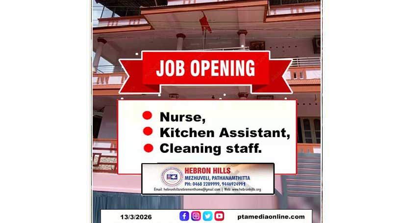 മെഴുവേലി – പതിറ്റാണ്ടുകളായി മെഴുവേലി പത്തിശ്ശേരിയിൽ ഡോ. മത്തായി ആലക്കോട് അച്ചന്റെ നേതൃത്വത്തിൽ പ്രവർത്തിക്കുന്ന ഹെബ്രോൻ ഹിൽസ് റിട്ടയർമെന്റ് ഹോമിലേക്ക് ജോലി ഒഴിവുകൾ താഴെ കൊടുക്കുന്നു…