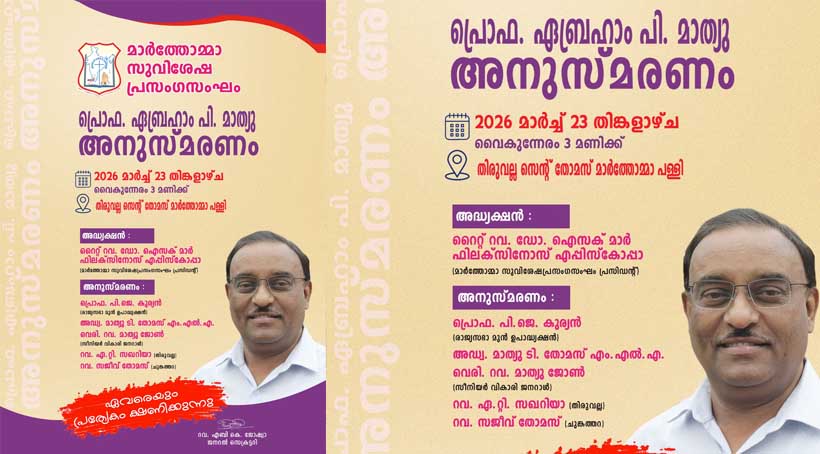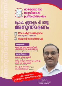 തിരുവല്ല – മാര്ത്തോമ്മാ സുവിശേഷപ്രസംഗസംഘത്തിന്റെ ലേഖക സെക്രട്ടറി അകാലത്തില് വിട്ടുപിരിഞ്ഞ പ്രിയ പ്രൊഫ. ഏബ്രഹാം പി. മാത്യുവിന്റെ സ്മരണകള്ക്ക് ആദരവ് അര്പ്പിക്കുന്നതിനായി മാര്ത്തോമ്മാ സുവിശേഷപ്രസംഗസംഘത്തിന്റെ നേതൃത്വത്തില് 2026 മാര്ച്ച് 23 തിങ്കളാഴ്ച വൈകുന്നേരം 3 മണിക്ക് തിരുവല്ല എസ്.സി.എസ്. പള്ളിയില് ഒത്തുച്ചേരുന്നു. മാര്ത്തോമ്മാ സുവിശേഷപ്രസംഗസംഘം പ്രസിഡന്റ് അഭിവന്ദ്യ ഡോ. ഐസക് മാര് ഫിലക്സിനോസ് എപ്പിസ്കോപ്പാ അദ്ധ്യക്ഷത വഹിക്കുന്ന പ്രസ്തുത മീറ്റിംഗിലേക്ക് ഏവരെയും സ്വാഗതം ചെയ്യുന്നതായി റവ. എബി കെ. ജോഷ്വാ, ജനറല് സെക്രട്ടറി വാർത്താക്കുറിപ്പിലൂടെ അറിയിച്ചു.