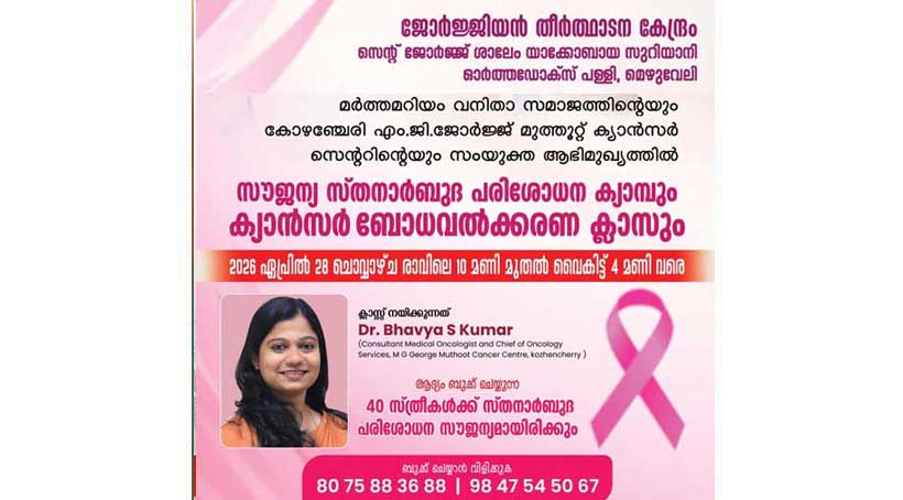 മെഴുവേലി: ജോർജ്ജിയൻ തീർത്ഥാടനകേന്ദ്രമായ മെഴുവേലി സെൻ്റ് ജോർജ്ജ് ശാലേം യാക്കോബായ സുറിയാനി ഓർത്തഡോക്സ് പള്ളിയിലെ മർത്തമറിയം വനിതാ സമാജത്തിൻ്റെയും , കോഴഞ്ചേരി എം.ജി.ജോർജ്ജ് മുത്തൂറ്റ് ക്യാൻസർ സെൻ്ററിൻ്റെയും സംയുക്താഭിമുഖ്യത്തിൽ സൗജന്യ സ്‌തനാർബുദ പരിശോധനാ ക്യാമ്പും, ക്യാൻസർ ബോധവൽക്കരണ ക്ലാസും സംഘടിപ്പിക്കുന്നു .ഏപ്രിൽ 28 ന് രാവിലെ എട്ടു മുതൽ വൈകിട്ട് നാല് വരെയാണ് ക്യാമ്പ്. ഡോ .ഭവ്യ.എസ്.കുമാർ ക്ലാസുകൾ നയിക്കും.ഇടവക വികാരി ഫാദർ വിപിൻ ജോൺ കുറിയാക്കോസ് ചടങ്ങ് ഉദ്ഘാടനം ചെയ്യും. ആദ്യം ബുക്ക് ചെയ്യുന്ന 40 സ്ത്രീകൾക്ക് പരിശോധന സൗജന്യം ആയിരിക്കും. ബുക്ക് ചെയ്യുന്നതിനായി 8075883688, 9847545067 എന്നീ നമ്പരിൽ ബന്ധപ്പെടുക .