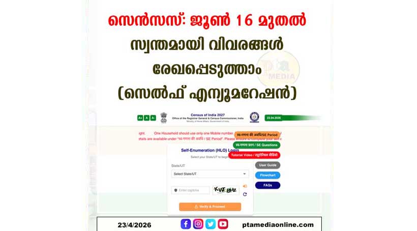 പത്തനംതിട്ട – സെൻസസ് 2027ന്റെ ഭാഗമായി പൊതുജനങ്ങൾക്ക് സ്വന്തമായി വിവരങ്ങൾ (സെൽഫ് എന്യൂമറേഷൻ) ജൂൺ 16 മുതൽ 30 വരെ ഓൺലൈനായി രേഖപ്പെടുത്താം. സെൻസസ് ഉദ്യോഗസ്ഥർ വീടുകളിൽ എത്തുന്നതിന് മുമ്പ് വ്യക്തികൾക്ക് തങ്ങളുടെ കുടുംബത്തിലെ വിവരം ഓൺലൈൻ പോർട്ടലിലൂടെ നേരിട്ട് സമർപ്പിക്കാനുള്ള സംവിധാനമാണ് സെൽഫ് എന്യുമറേഷൻ. 15-20 മിനിറ്റിനുള്ളിൽ പ്രക്രിയ പൂർത്തിയാക്കാം.