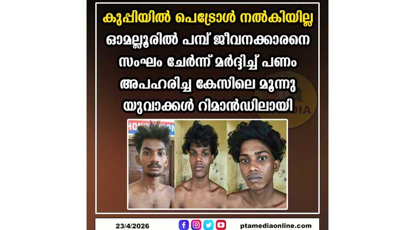 പത്തനംതിട്ട: ഓമല്ലൂരിലെ പെട്രോൾ പമ്പിൽ കുപ്പിയിൽ ഇന്ധനം നൽകിയില്ലെന്നാരോപിച്ച് ജീവനക്കാരനെ മർദിക്കുകയും പണം കവരുകയും ചെയ്ത കേസിൽ മൂന്നു യുവാക്കൾ റിമാൻഡിൽ. പ്രമാടം ളാക്കൂർ പുതുപ്പറമ്പിൽ സൂരജ് (19), ഓമല്ലൂർ ഐമാലി വിളാകം പുരയിടം പ്രേംജിത്ത് പ്രസാദ് (19), മണ്ണാറമല ഇലവുന്തറ പുത്തൻവീട്ടിൽ വിഷ്ണു ഭാസ്‌കരൻ (19) എന്നിവരാണ് അറസ്റ്റിലായത്. പമ്പ് ജീവനക്കാരൻ ചെന്നീർക്കര സ്വദേശി രഞ്ജിത്തിനാണ് മർദനമേറ്റത്. പ്രതികൾ ഹെൽമറ്റ് കൊണ്ട് രഞ്ജിത്തിനെ മർദ്ദിക്കുകയും കൈവശമുണ്ടായിരുന്ന പെട്രോൾ വിൽപ്പന നടത്തിയ രണ്ടായിരത്തോളം രൂപ അപഹരിക്കുകയും ചെയ്തു.