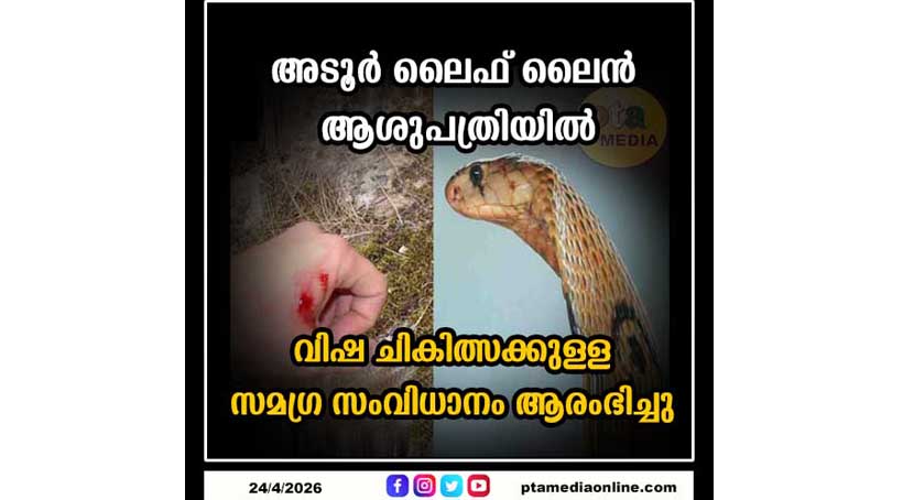 അടൂർ – സമഗ്രമായ വിഷ ചികിത്സാ സംവിധാനം അടൂർ ലൈഫ് ലൈൻ ആശുപത്രിയിൽ ആരംഭിച്ചു. ഏത് തരത്തിലുള്ള പാമ്പ് കടിയേയും നേരിടാനായി ആവശ്യമായ ആന്റിവെനം ലൈഫ് ലൈനിൽ ലഭ്യമാക്കിയിട്ടുണ്ട്. മൂർഖൻ, വെള്ളിക്കട്ടൻ തുടങ്ങിയ പാമ്പുകളുടെ കടി നാഡീവ്യൂഹത്തെ ബാധിക്കുമ്പോൾ, അണലി, ചുരുട്ട, തുടങ്ങിയവ രക്തത്തെയും വൃക്കകളെയുമാണ് കൂടുതലായി ബാധിക്കുന്നത്. ഇത്തരത്തിൽ എല്ലാമുള്ള പാമ്പുകളുടെ കടിയേൽക്കുന്നവരുടെ ചികിത്സക്കായി 24 മണിക്കൂറും പ്രവർത്തിക്കുന്ന ആധുനീക സൗകര്യത്തോടുകൂടിയ ഐ സി യൂ, വെന്റിലേറ്റർ സൗകര്യം, കണ്ടിന്യുവസ് റീനൽ റീപ്ലേസ്മെന്റ് സൗകര്യത്തോടുകൂടിയ ഡയാലിസിസ് യൂണിറ്റ്, എമർജൻസി വിഭാഗം, ക്രിട്ടിക്കൽ കെയർ യൂണിറ്റ്, ന്യൂറോളജി വിഭാഗം, വൃക്കരോഗ വിഭാഗം, ബ്ലഡ് ബാങ്ക്, ലബോറട്ടറി സൗകര്യം, എന്നിവ ലൈഫ് ലൈനിൽ സജ്ജമാണ്. എമർജൻസി ആവശ്യങ്ങൾക്കു 9188941960, 9400023355, 9188619302 എന്നീ നമ്പറുകളിൽ വിളിക്കാവുന്നതാണ്.