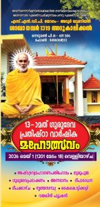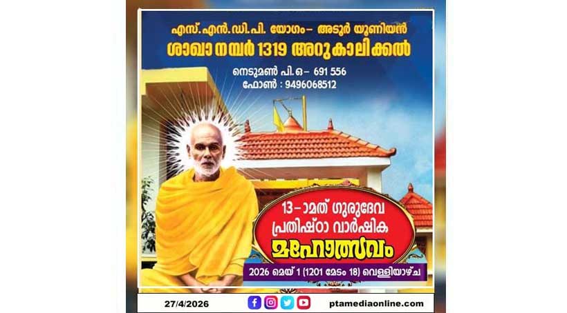 അടൂർ – ശ്രീനാരായണ ധർമ്മ പരിപാലന യോഗമെന്ന മഹാപ്രസ്ഥാനത്തിന്റെ ഭാഗമായ 1319 നമ്പർ എസ്എൻഡിപി ശാഖായോഗം ഗുരുക്ഷേത്രത്തിലെ 13-മത് ഗുരുദേവ പ്രതിഷ്ഠാ വാർഷിക മഹോത്സവം 2026 മെയ് 1 (1201 മേടം 18) വെള്ളിയാഴ്ച ക്ഷേത്ര തന്ത്രി രതീഷ് ശശിയുടെ മുഖ്യ കാർമ്മികത്വത്തിൽ സമുചിതമായി ആഘോഷിക്കുന്നു.